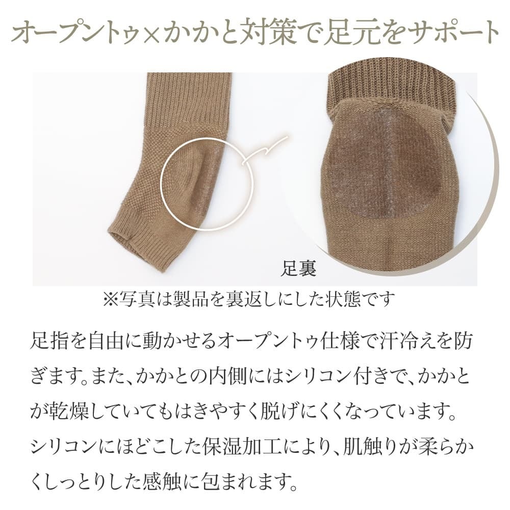 足指を自由に動かせるオープントゥ仕様で汗冷えを防ぎます。