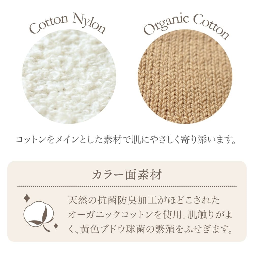 シンプルなデザイン。パイル調の面と、天然の抗菌防臭加工を施したオーガニック